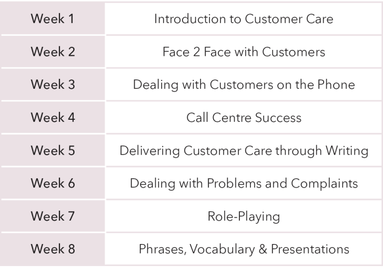 Vocabulary and phrases building, presentations in different roles of customer care, review and field trip.